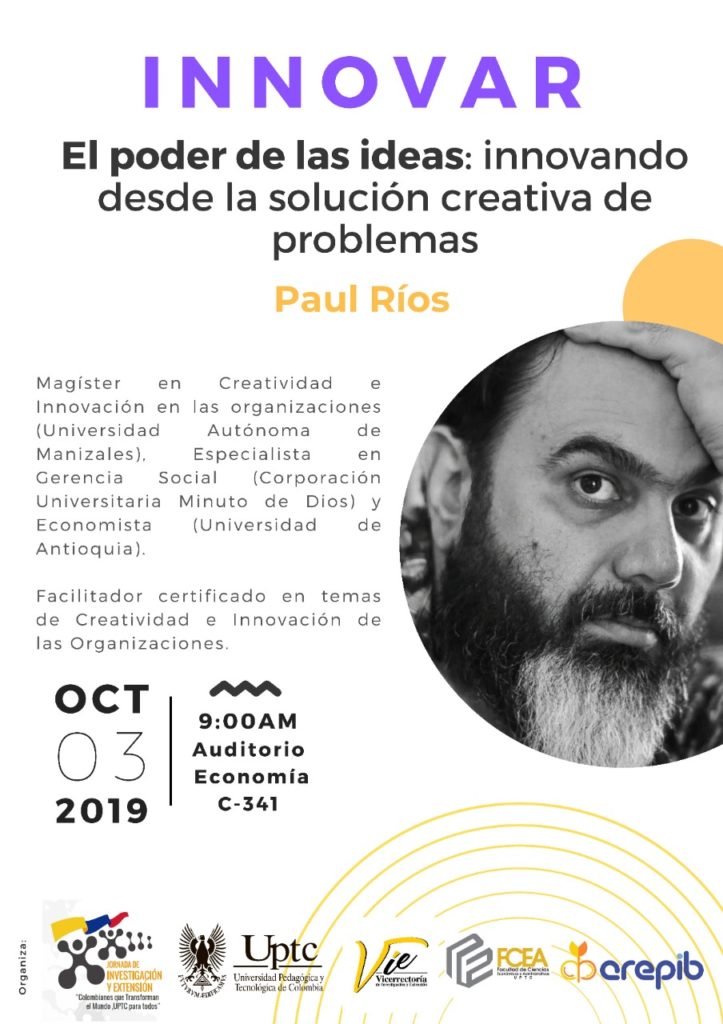 El CREPIB, con el apoyo de la Dirección de Investigaciones y el CENES, en el marco de la XXII Jornada de la Investigación y Extensión de la UPTC, invita a estudiantes y graduados a participar en este taller de Innovación el próximo Jueves 03 de Octubre. Esta actividad será dirigida por Paul Ríos, profesional y consultor destacado.